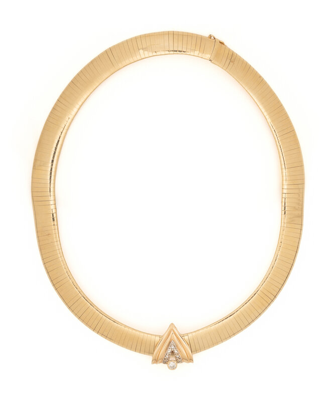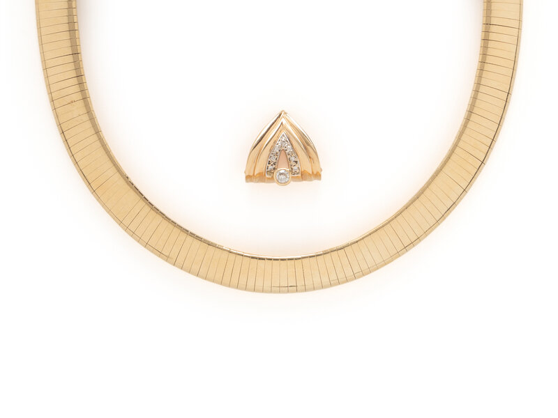 Including an omega necklace measuring approximately 12.00 mm with a removeable slider charm set with round brilliant cut diamonds weighing approximately 0.20 carat total. Mounted in 14 karat yellow gold. 15 inches long.