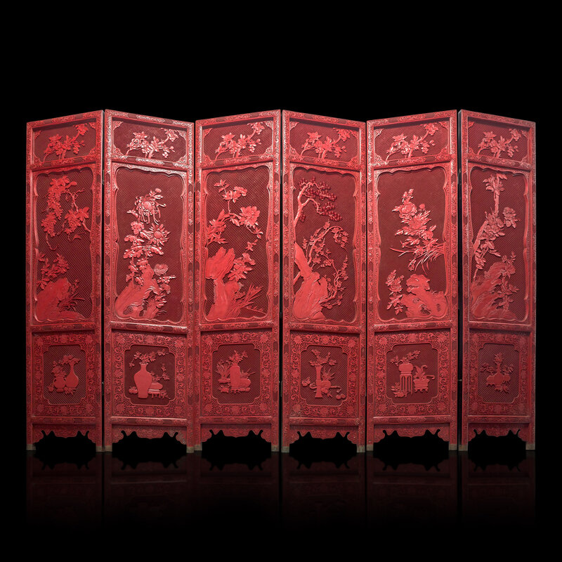 A Chinese Carved Cinnabar Lacquer Six-Panel Floor Screen, 20th Century