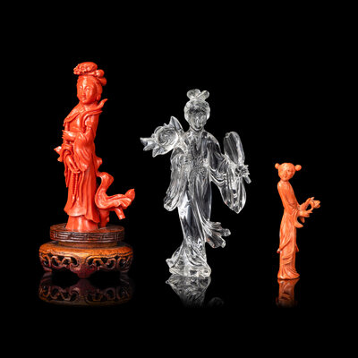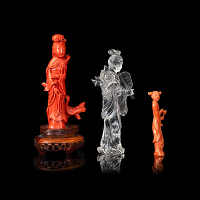 Two Chinese Red Coral Figures and a Rock Crystal Figure