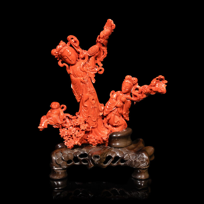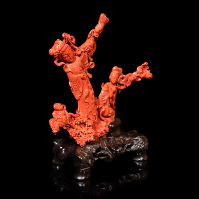 近代 紅珊瑚雕天女散花連木座