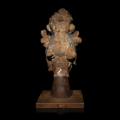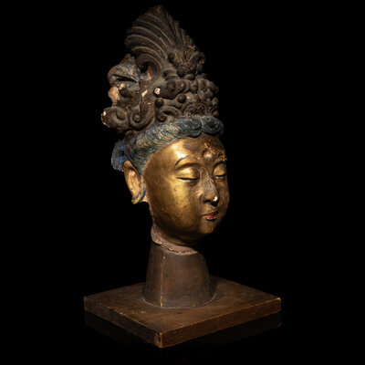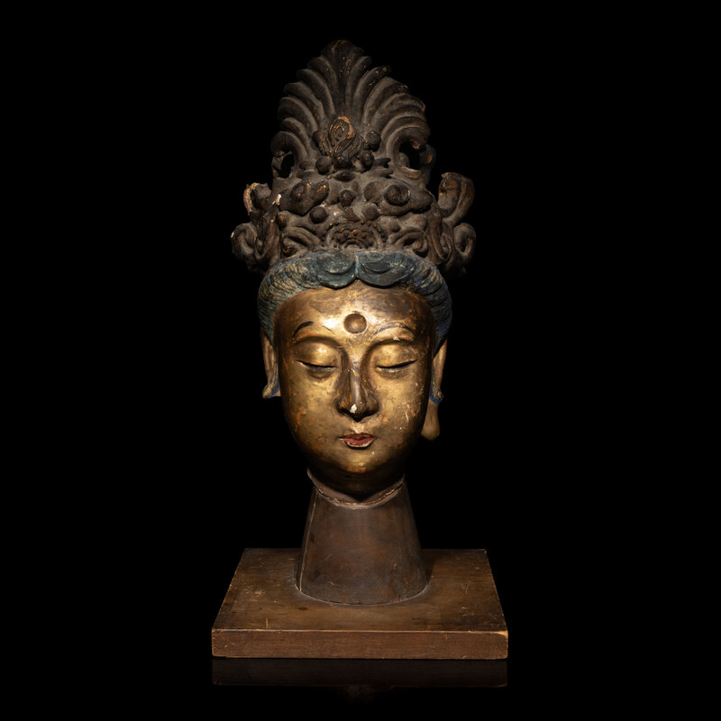 Mounted on a wooden base. The oval face sensitively carved with a benevolent expression, flanked by large ears with pendulous earlobes, the hair parted into sections and gathered into a sophisticated high chignon.