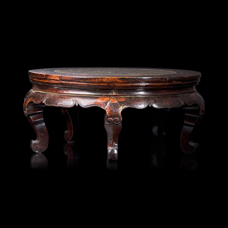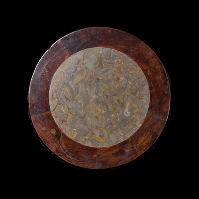 The circular puddingstone panel set in a five-legged lacquered wood stand.