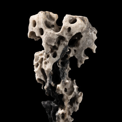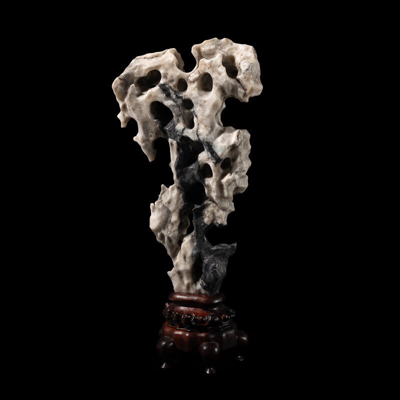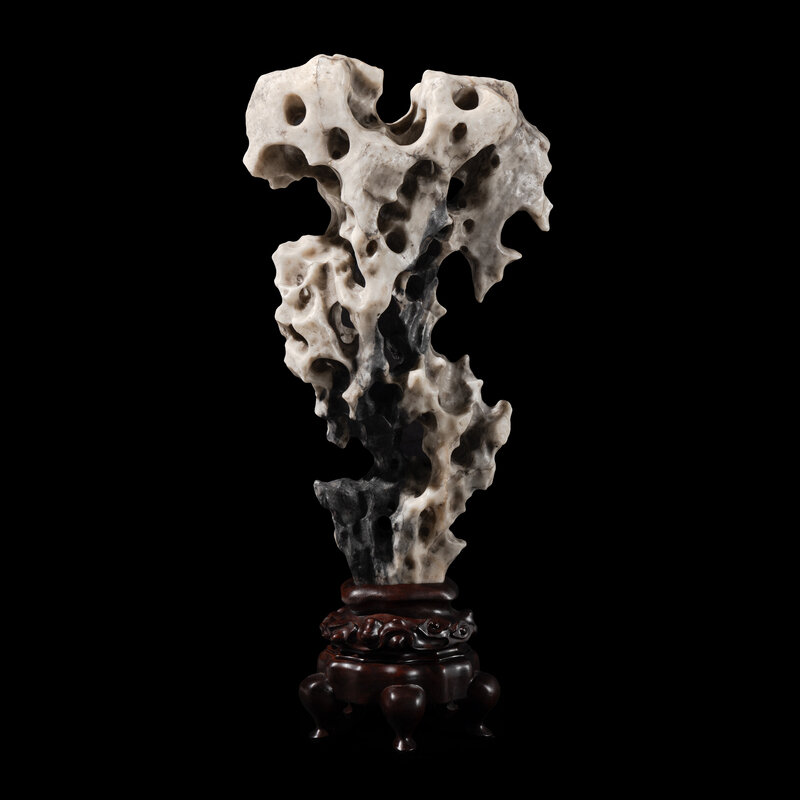 vertically oriented, the stone with an irregular structure and punctuated with openings, Suzhou-type wood stand.