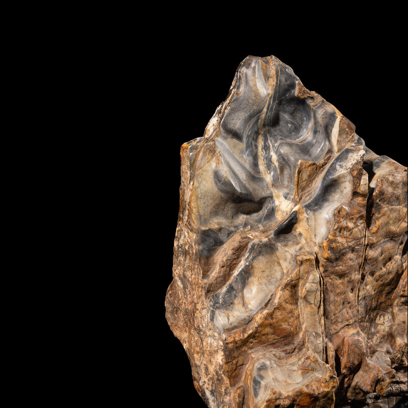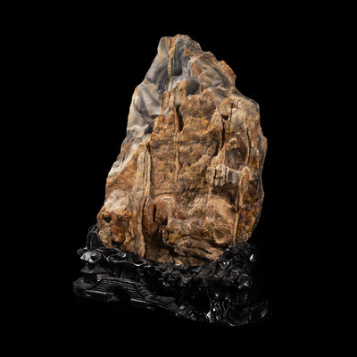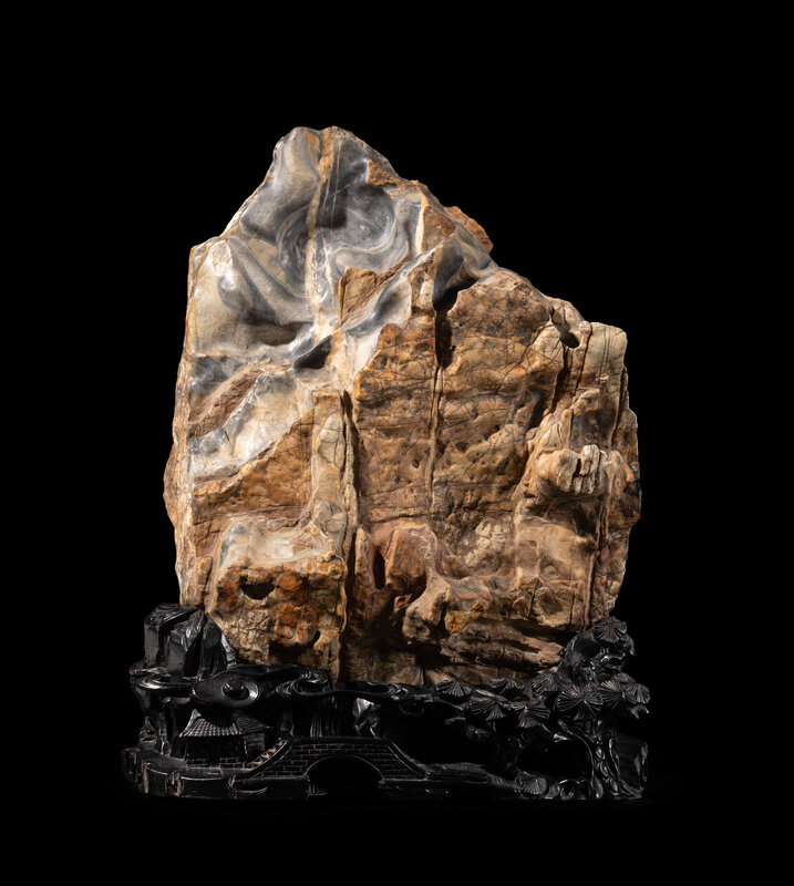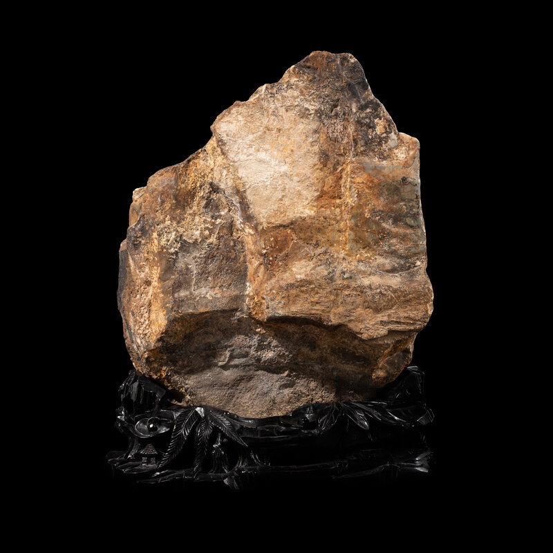 The horizontal stone has 'natural' layered formations, raised on a fitted hardwood stand.