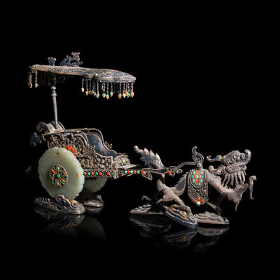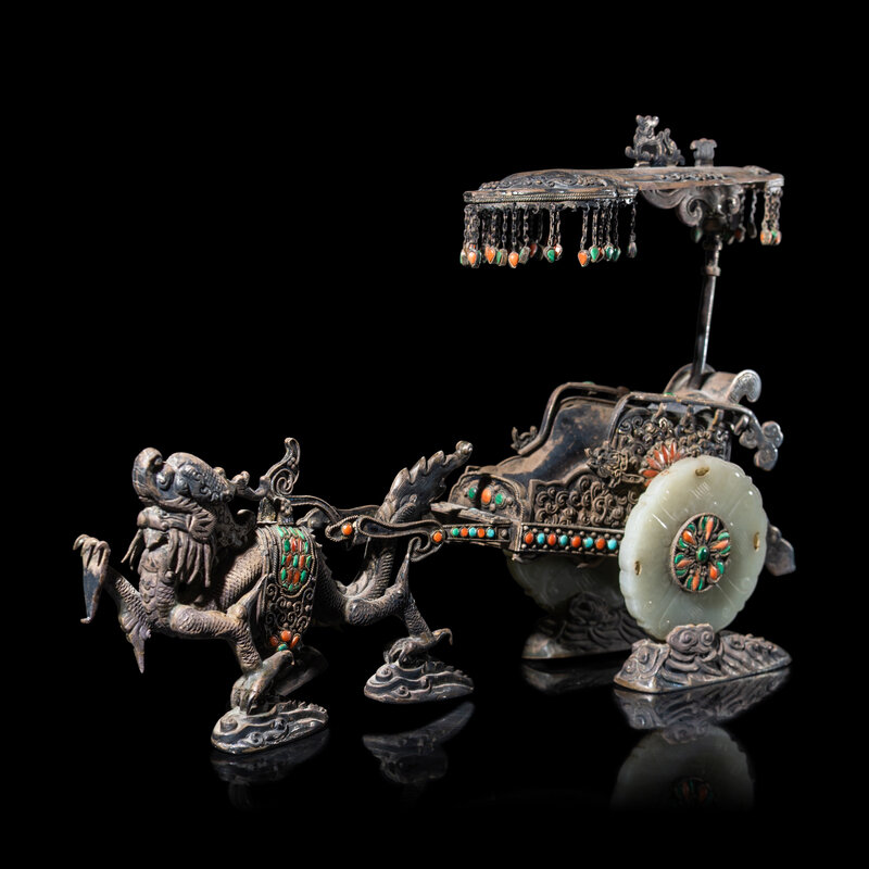 A Chinese Jade-Mounted and Hardstone Embellished Silver Chariot, 20th Century