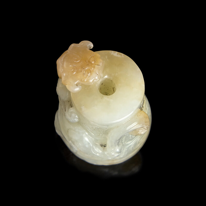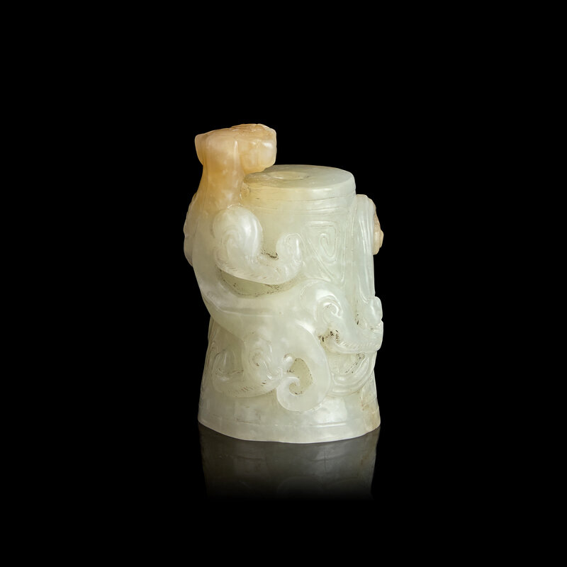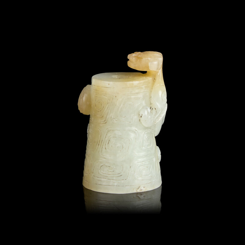The form is possibly inspired by an archaic sword scabbard chape, decorated with low relief motifs and a crouching chilong.