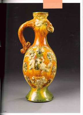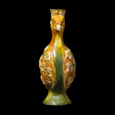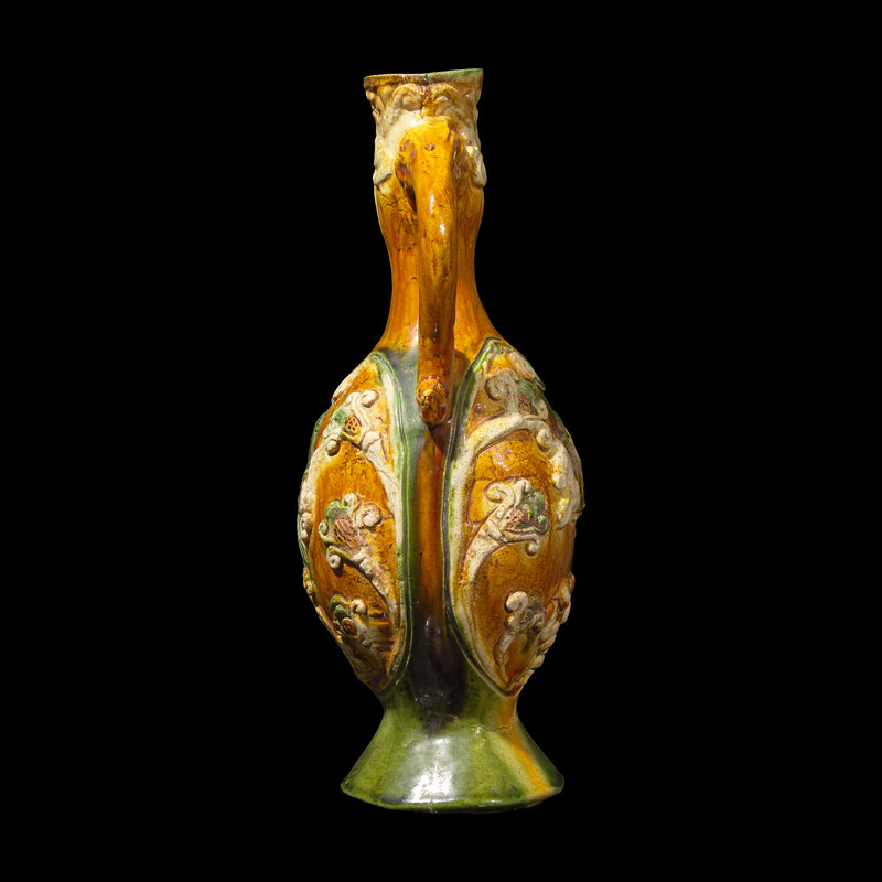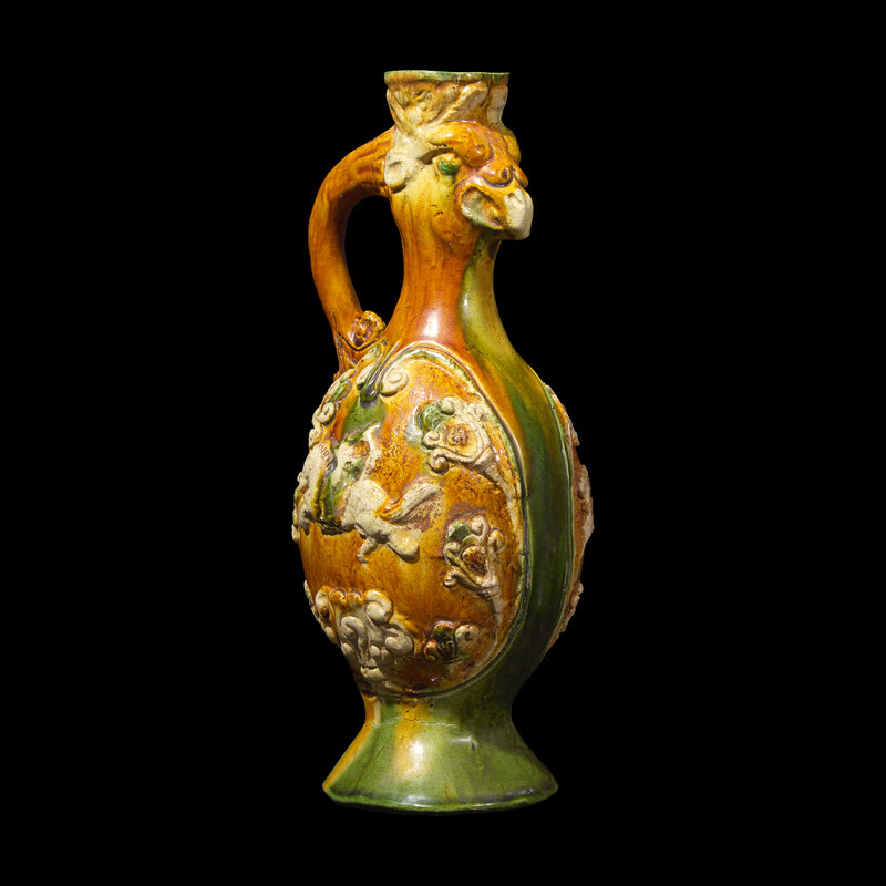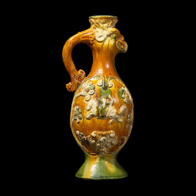 The ovoid body is relief-decorated on one side with an equestrian among stylized flowerheads, the other side with a Phoenix, the handle molded as the stem of a blossoming bell-flower, the neck modeled as a phoenix head grasping a pearl in the beak, below an ovoid mouth at the top of the head;