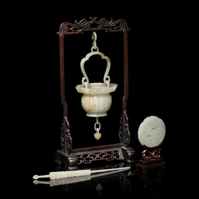 晚清-民國 青白玉花片、耳挖簪及花籃擺件