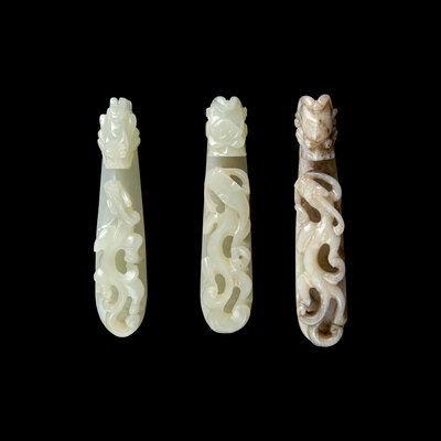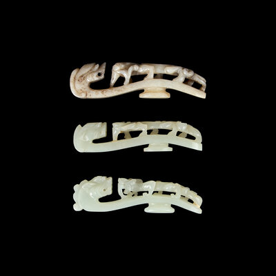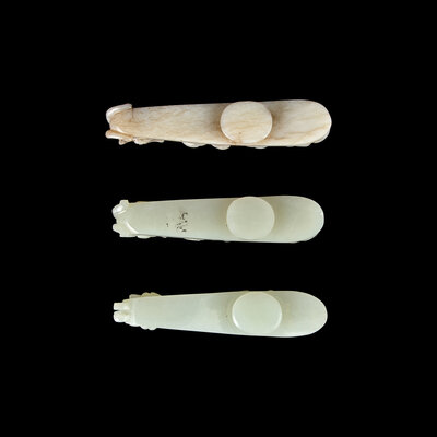 A Chinese 'Chicken-Bone' Jade and Two Pale Celadon Jade 'Dragon' Belt Hooks, Qing Dynasty