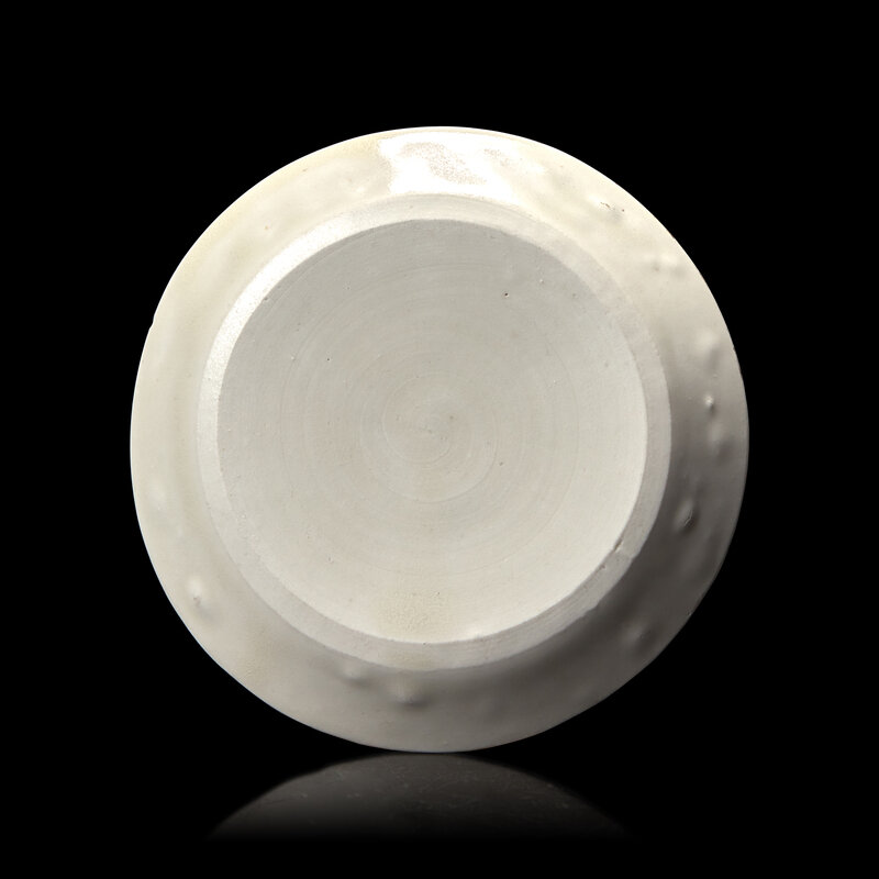 Of shallow circular form with flared sides, centered by an incised stylized lotus; flat underside, transparent ivory glaze pooling to a light olive tone.