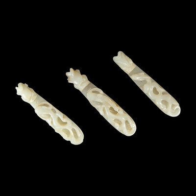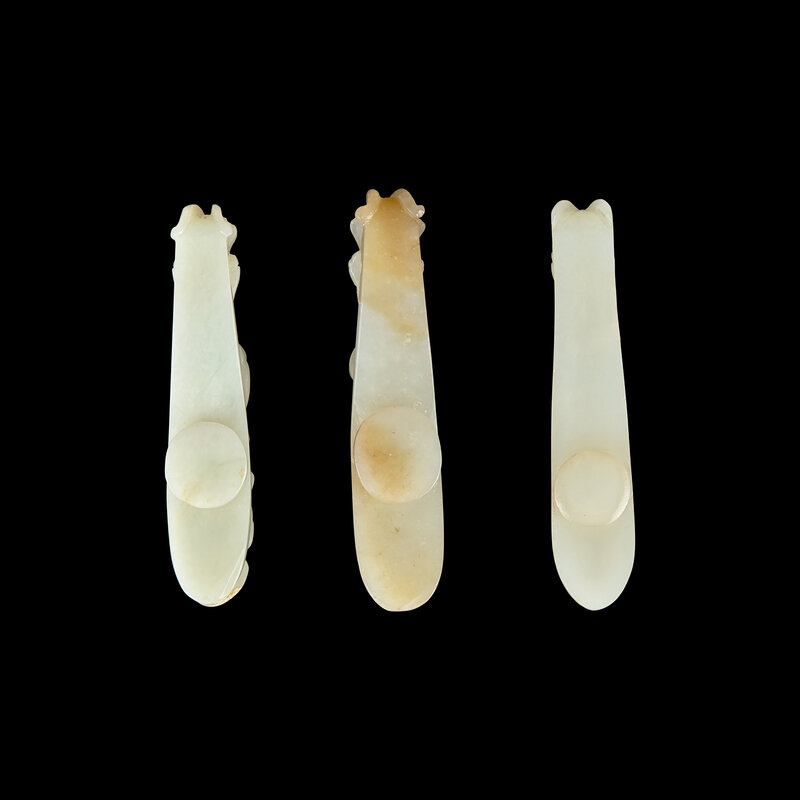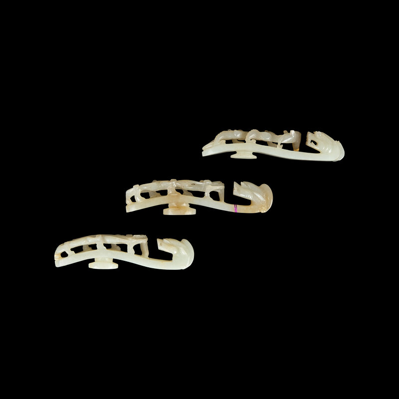 Three Greyish White Jade 'Dragon' Belt hooks, Qing Dynasty