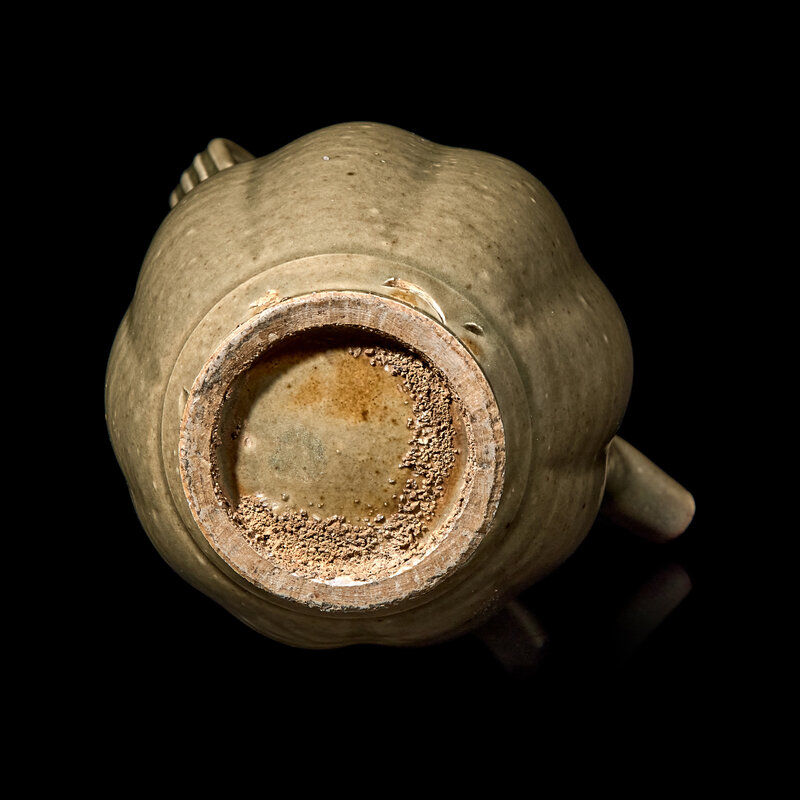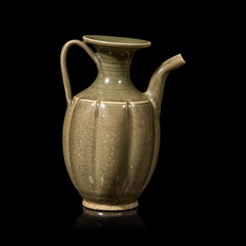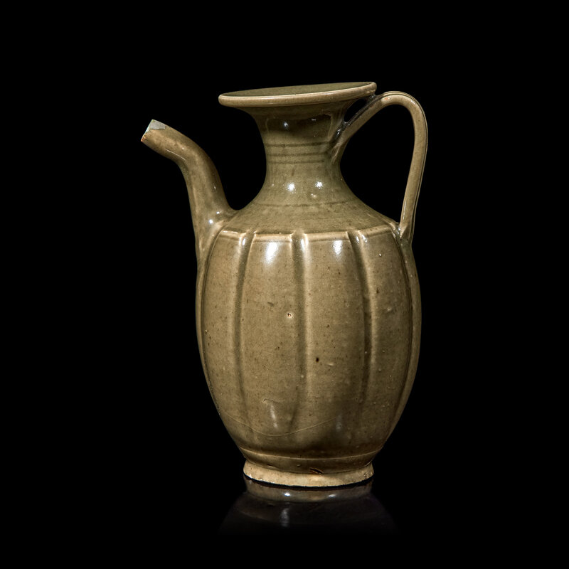 Covered with even celadon glaze, the ewer's handle embellished with groves motifs, the body similarly decorated.