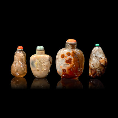 The group consists of an eggplant form snuff bottle, one with a carved lotus, one pebble form, and the largest one with a carved bat.