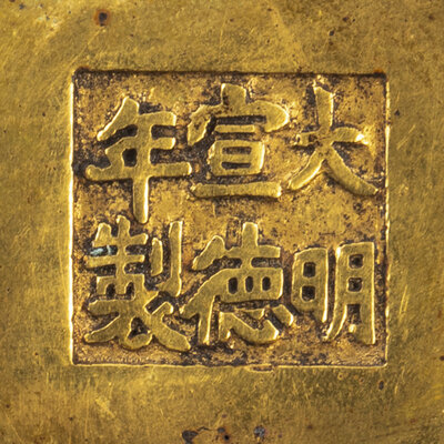 The censer is decorated with lotus blossoms amongst scrolling foliage. Flanked by two lion-head handles, with a Xuande mark at bottom.