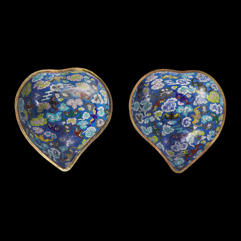 The exterior is decorated with peach branches and bats against a turquoise ground with ‘wan’ fret diapers, the interior with bats in various colors amidst clouds on a blue ground, with a wood stand