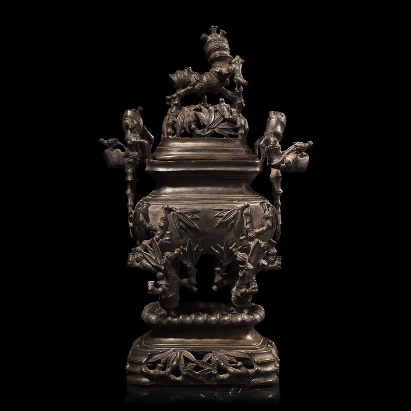 A Small Chinese Bronze 'Bamboo and Birds' Covered Censer, 19th-Early 20th Century
