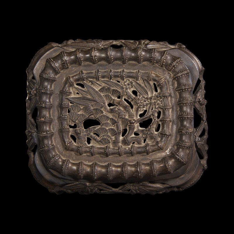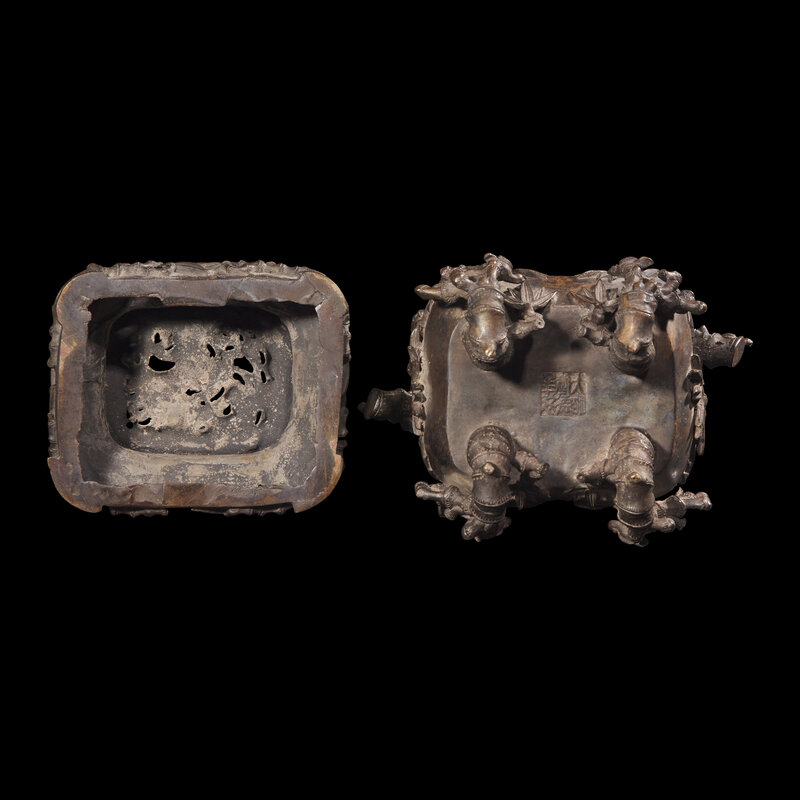 Elaborately cast to represent numerous bamboo segments, among which are perched small birds, the underside of the censer with a cast six-character apocryphal Xuande mark.