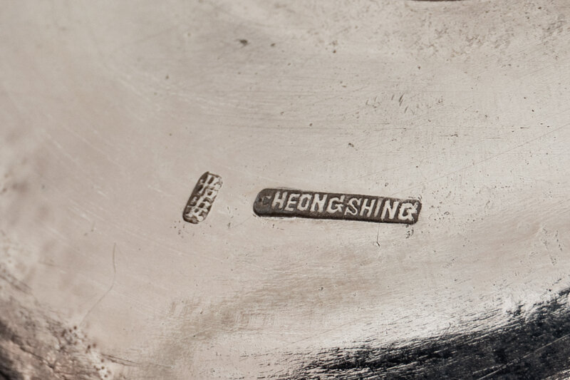 Decorated with Auspicious animals, fruits and flowers, with "bamboo" handles and stem; mark "怡安", "Cheong Shing".
