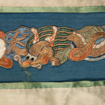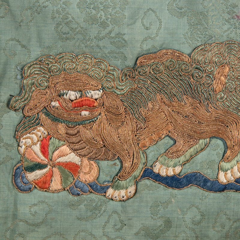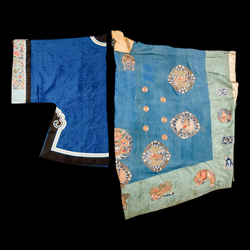 清晚期 藍地盤金繡游龍瑞獸纹道袍及藍地織錦女褂