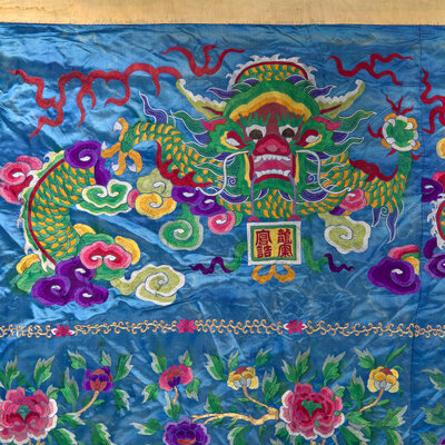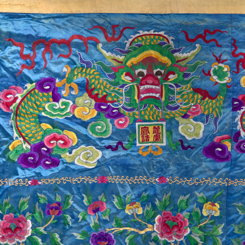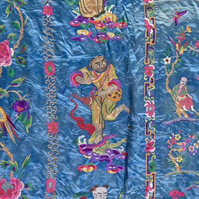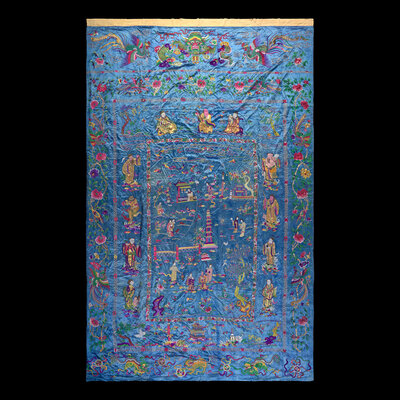 A Massive Chinese Blue Ground Embroidered Silk 'Immortals' Wall Panel, Late 19th/Early 20th Century