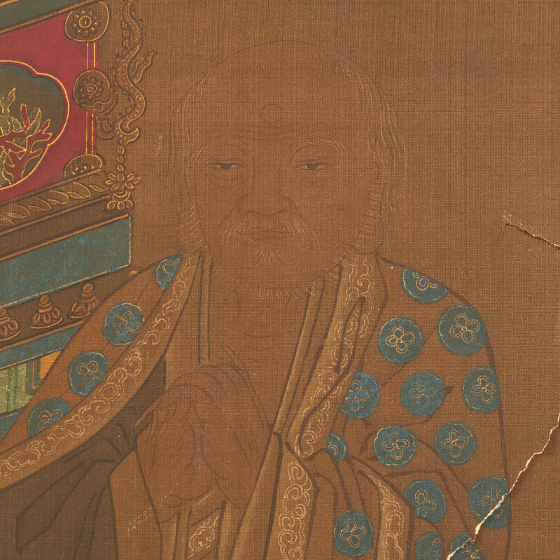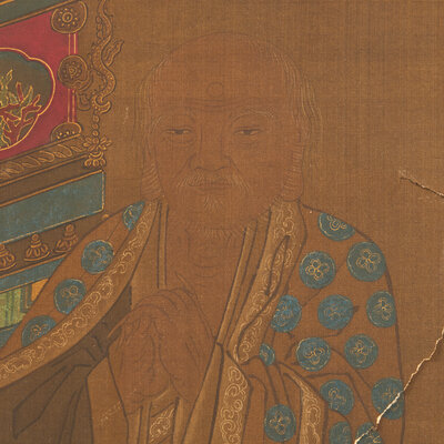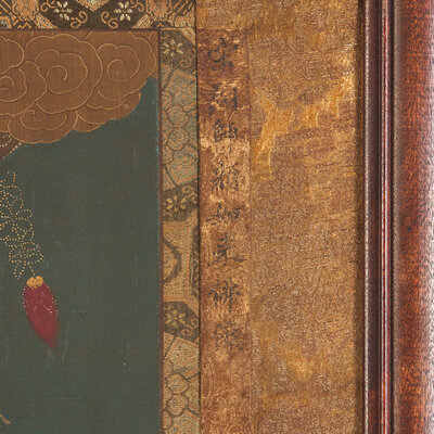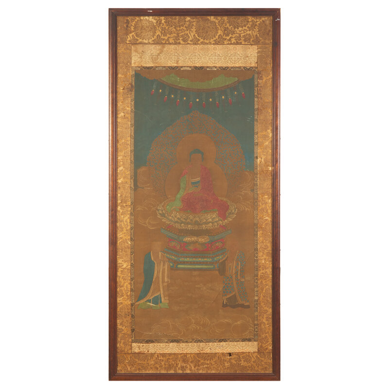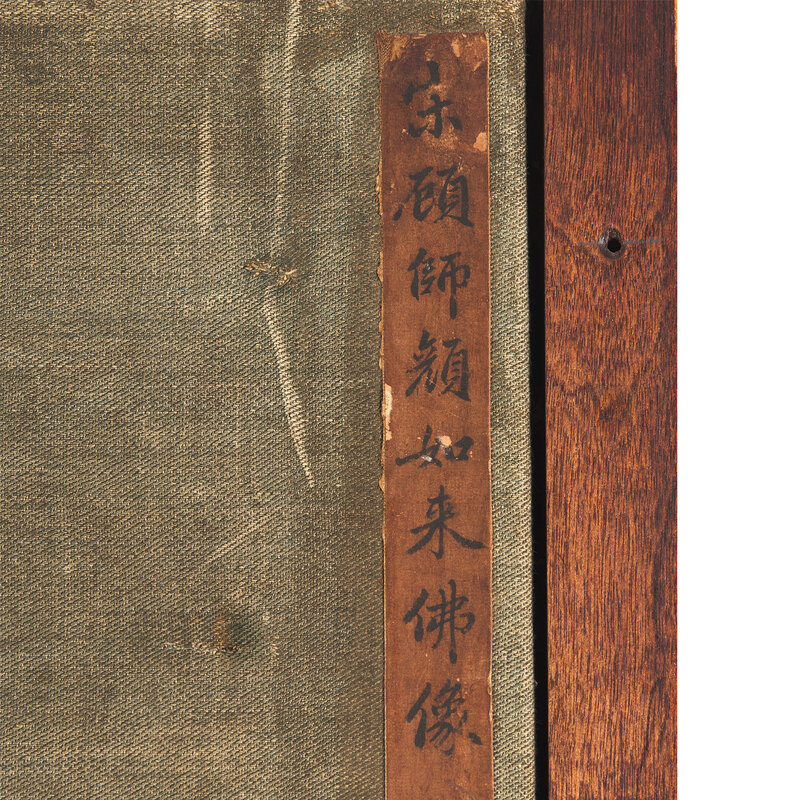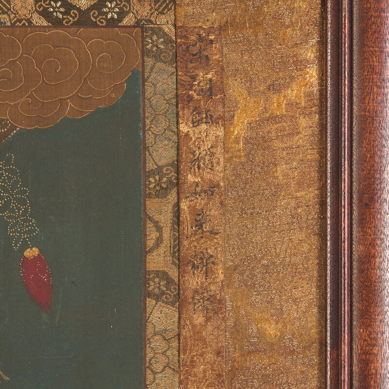 Ink and color on silk, abraded title slip to upper right of painting; Japanese brocade mounts, mounted on Japanese support and framed. Back bearing title slip inscribed Song Gu Shiyan Ru Lai Xiang.