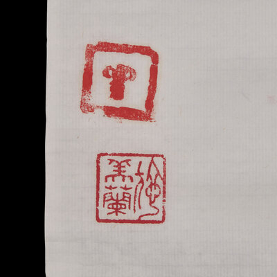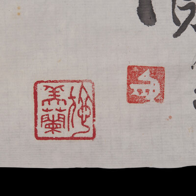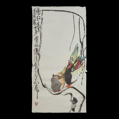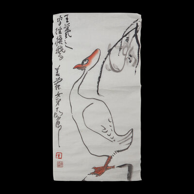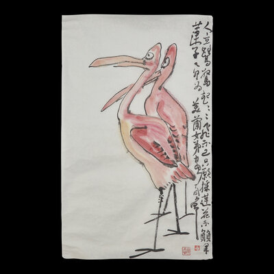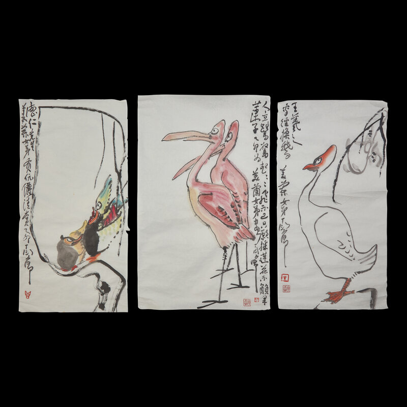 The first A Pair of Mandarin Ducks on a Branch, dedicated to Deren and Mielan Nvdi, inscribed, dated to an Yimao year (equivalent to 1975), signed and with one seal; The second The Goose Earned by Wang Xizhi, inscribed, dedicated to Milan Nvdi, signed and with two seals; The third A Pair of Long-Legged Waterbirds, inscribed, dated to an Yimao year (equivalent to 1975), dedicated to Mielan Nvdi, signed and with two seals.