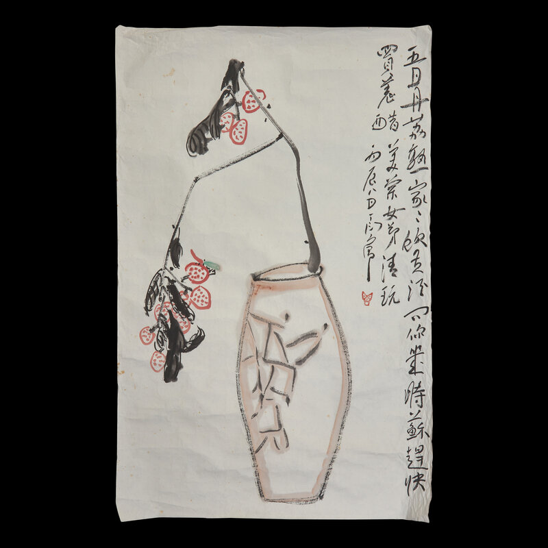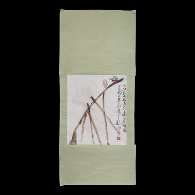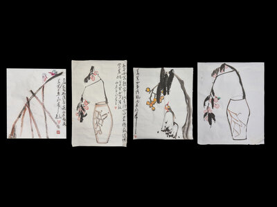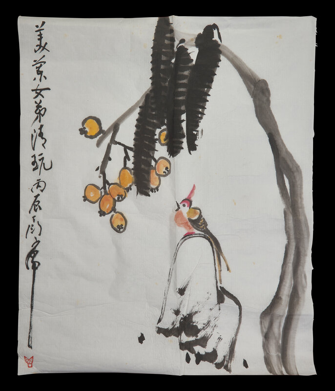 The first inscribed, dedicated to Meilan Nvdi, dated to a Bingchen year (equivalent to 1976), eighth month, signed and with one seal; the second of similar composition, but uninscribed; the third with two birds on a branch, mounted on pale green paper, inscribed, dated to a Bingchen year (equivalent to 1976), dedicated to Meilan Nvdi, signed and with two seals; the fourth A Bird with Loquats, dedicated to Meilan Nvdi, dated to a Bingchen year (equivalent to 1976), signed and with one seal.