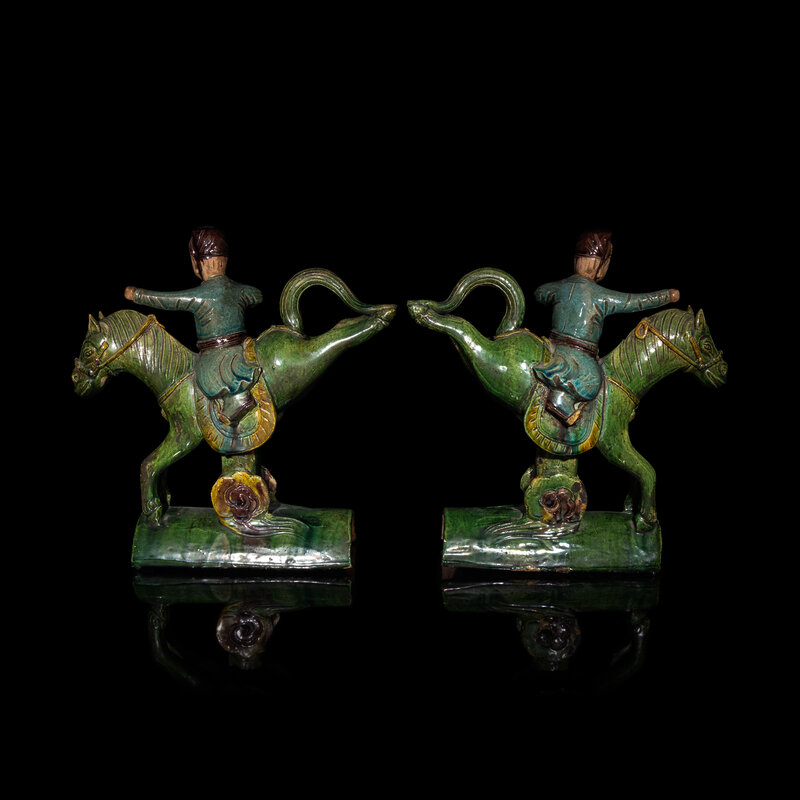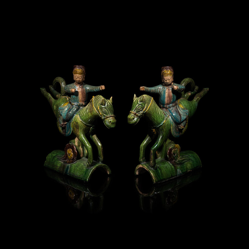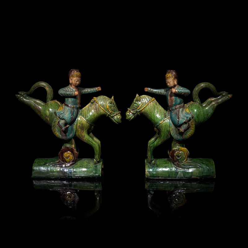A Pair of Chinese Sancai Glazed Equestrian Ridge Tiles, Ming Dynasty