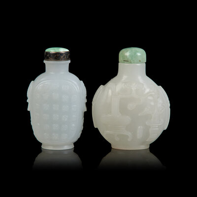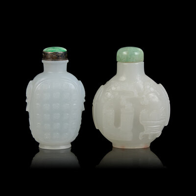 One carved with Antiques, light green hardstone stopper button; the other with a field of bosses to each side, jadeite stopper button.
