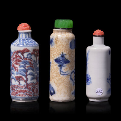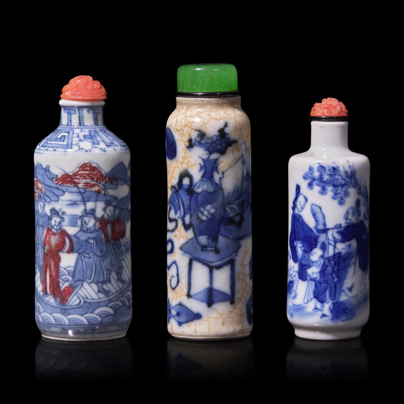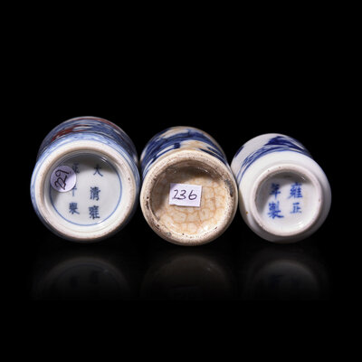 One decorated with auspicious symbols, crackle glaze; the second with figures in a landscape, underside with four-character Yongzheng mark; the third also with underglaze red, decorated with high-ranking figures in a landscape, underside with four-character Yongzheng mark; glass stopper buttons.