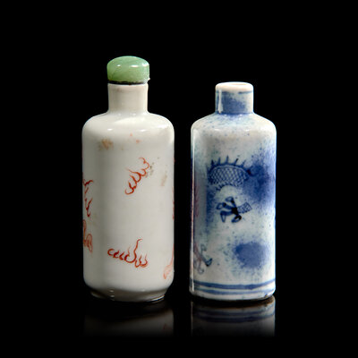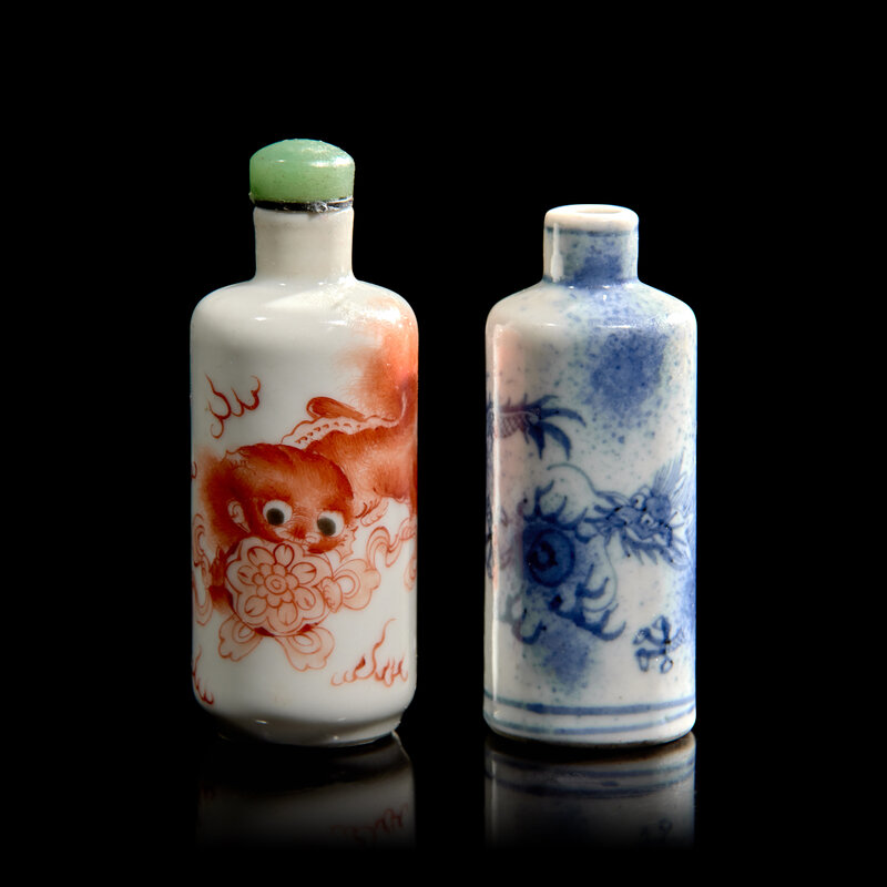 The group consist of a blue and white dragon snuff bottle, and a larger iron-red lion snuff bottle.