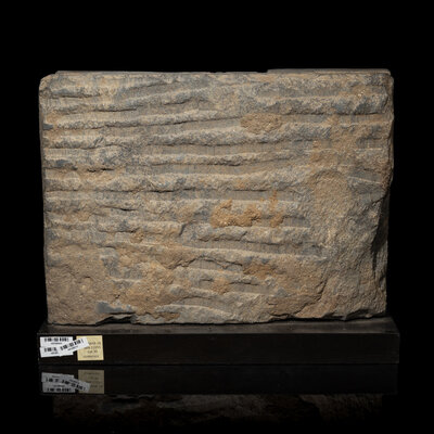The rectangular panel carved to the front in high relief shows the Buddha seated, backed by a large halo, Vajrapani standing on his left, a younger figure to his right conversing with two Kashyapa and his followers.
