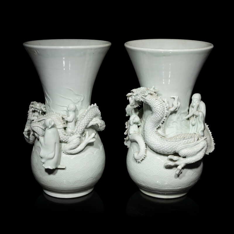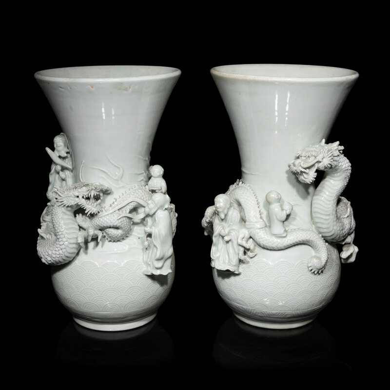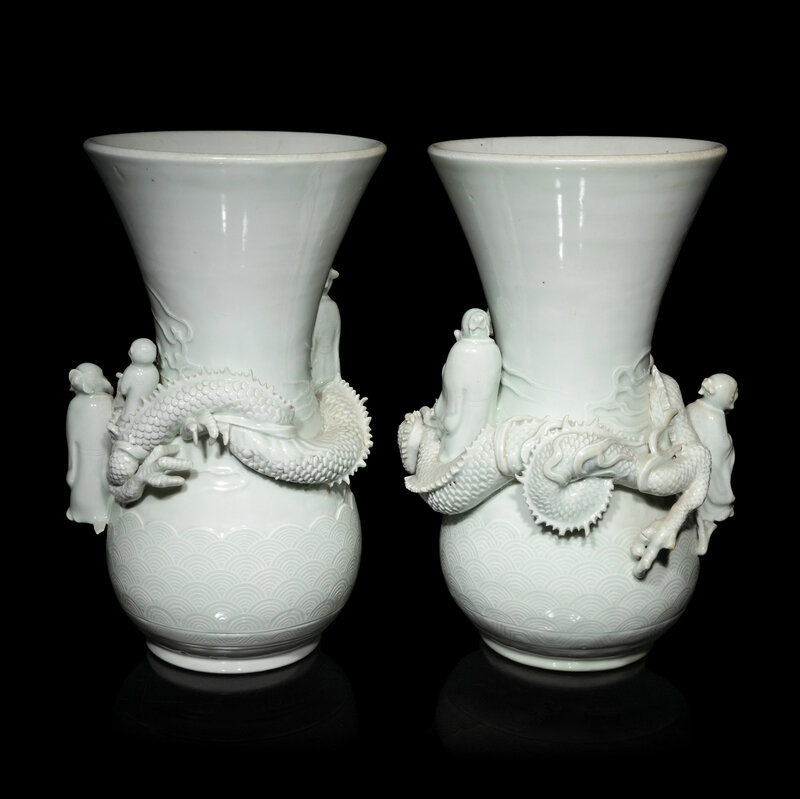 Each vase finely molded with figures standing above a sinuous dragon, the exterior incised with crashing waves.