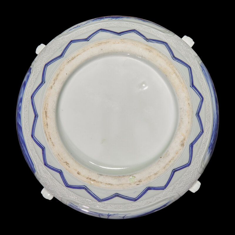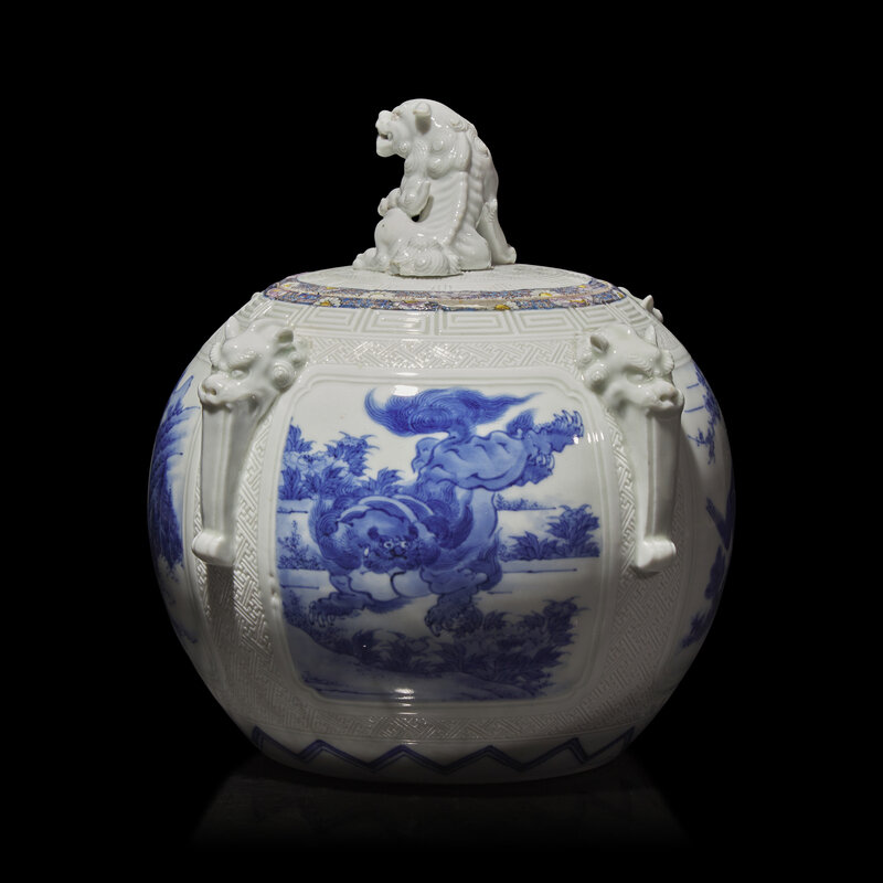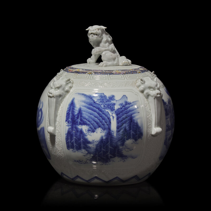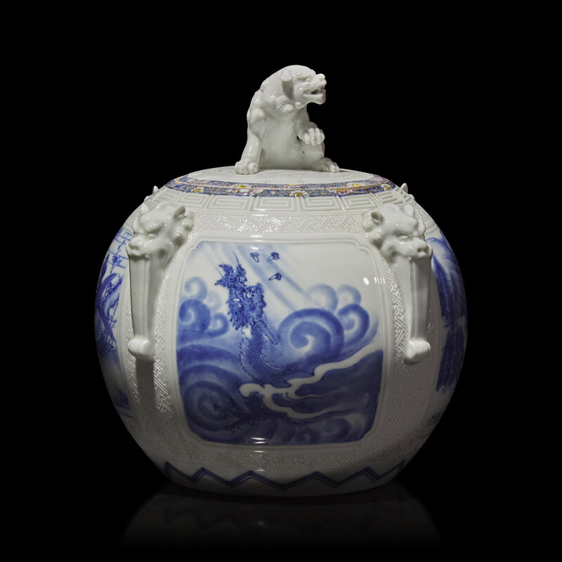 The slightly domed cover with shishi finial; the body decorated with four underglaze blue reserves of cranes, a dragon, shishi, and landscape with waterfall; applied beast-head "handles" to shoulder; unusual enameled floral borders to rim of jar and cover.