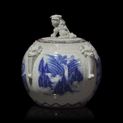 日本明治時期 平戶燒山水瑞獸圖獅紐蓋罐