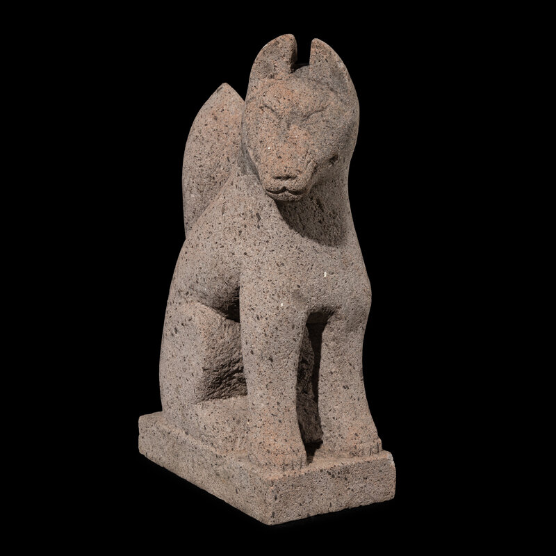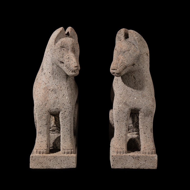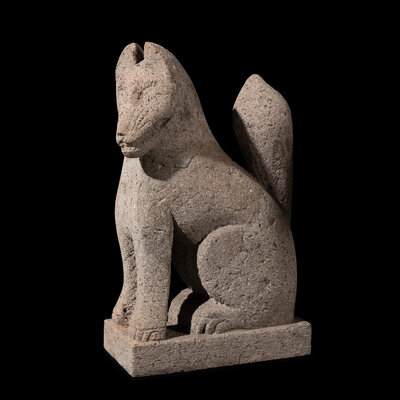 A rare and impressive pair of antique Japanese stone Kitsuné, traditionally placed on either side of the entrance to a Shinto shrine. In Japanese mythology, foxes are sacred creatures and serve as the messengers of Inari, the Shinto goddess of rice, agriculture, and prosperity. As such, they play a vital role in spiritual communication, carrying the prayers of worshippers to the deity.