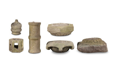 At its base is a rough-hewn foundation stone, intentionally left in its natural state, intended to be partially buried in the earth. Above it rests a central pillar, positioned within a double lotus base. The pillar supports a reversed double lotus platform, upon which sits the six-sided lantern house. This central section features two panels with rectangular openings for tending candles, while two others are decorated with raised swirling cloud motifs and a circular opening representing the full moon. The remaining panels are carved in relief with rolling hills and a deer, a traditional Japanese symbol of longevity.