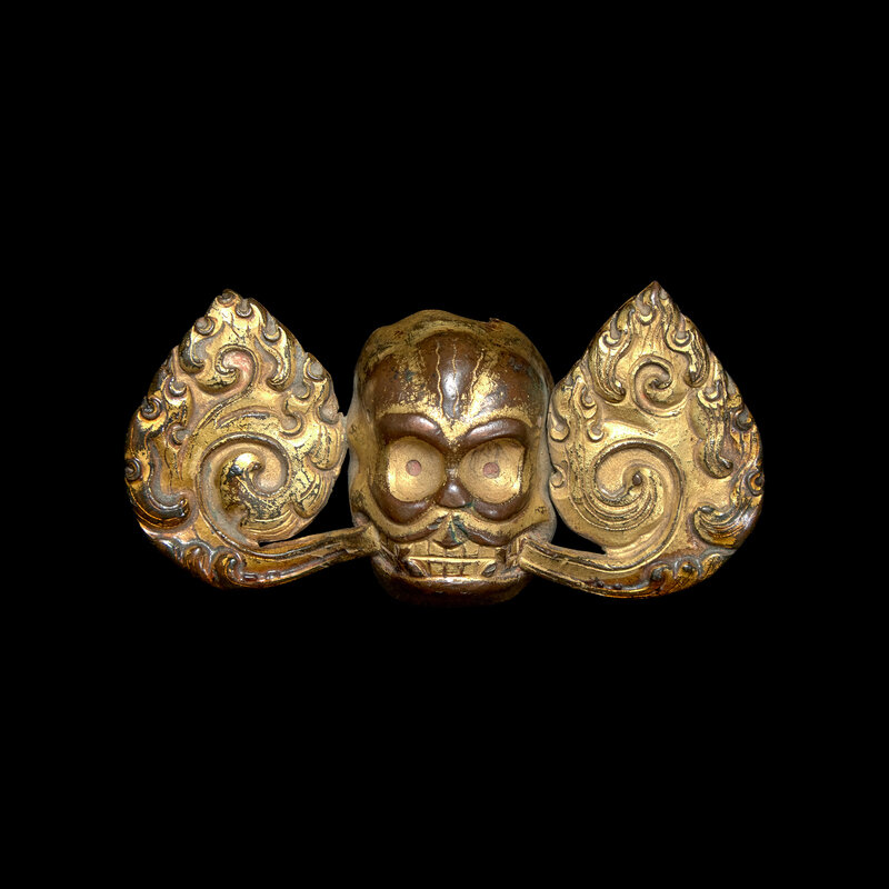A Tibetan Gilt Copper Alloy Repousse ‘Flaming Skull’ Fitting, 18th/19th Century