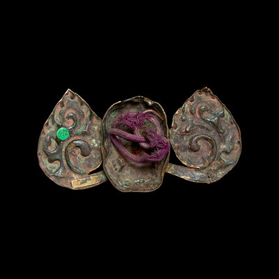Probably an ornament to an oracle's crown or cap. Depicting a skull flanked by flames.