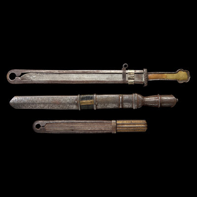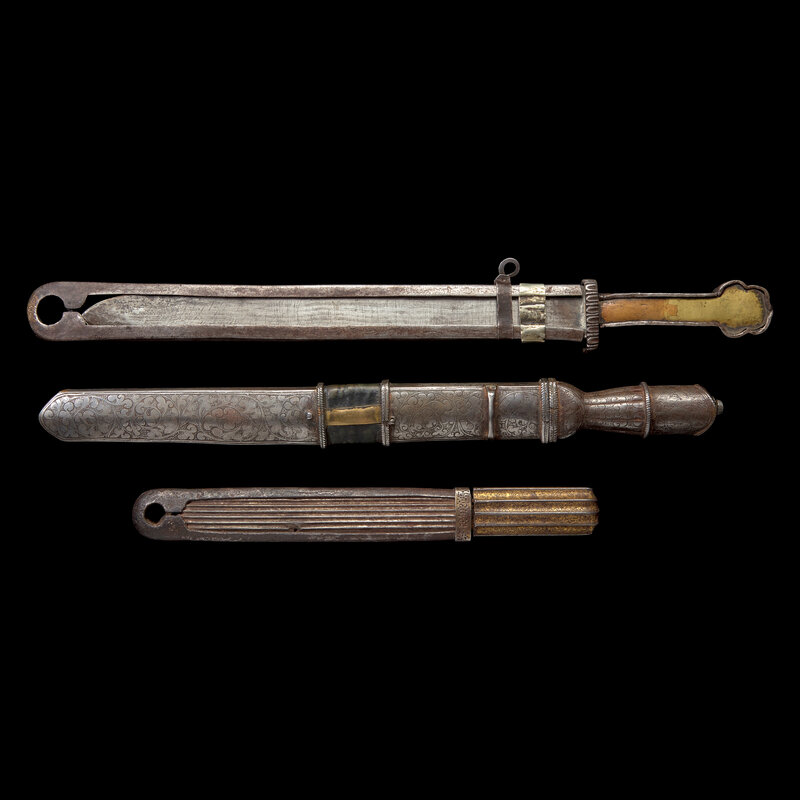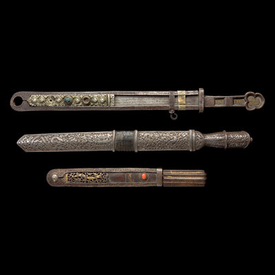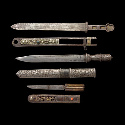 Consists of two larger blades and a smaller dagger, all with associated scabbards.