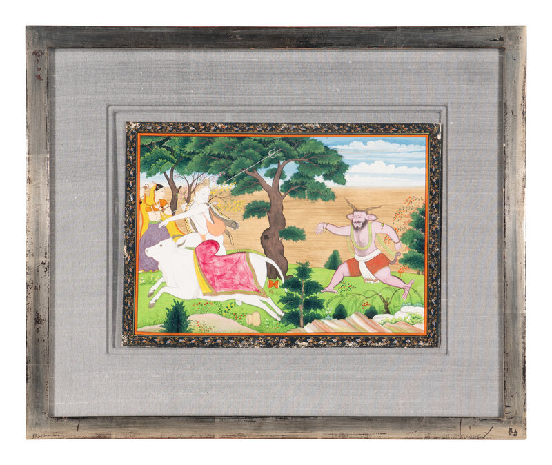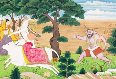 Gouache and gold on paper; depicting Bhasmasura chasing after Shiva.