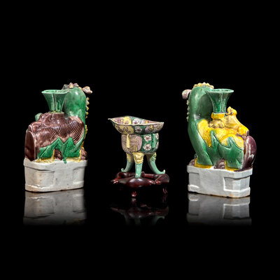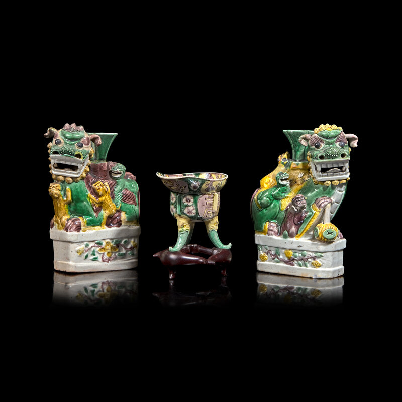 A Pair of Small Famille Verte 'Buddhist Lions' Vases and a Libation Cup, Kangxi Period