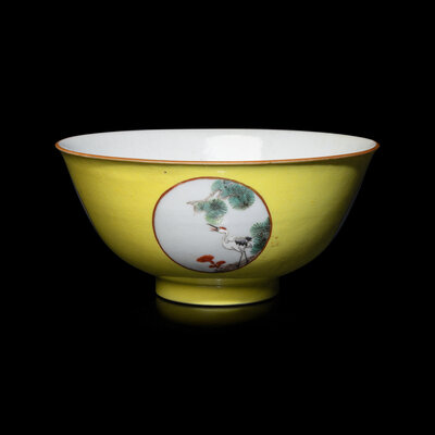 清中期 黃地粉彩開光松鶴延年圖碗