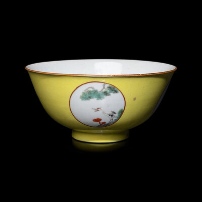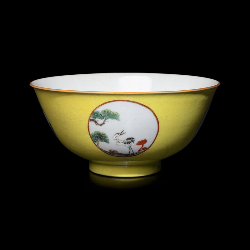 Enamelled around the exterior with four roundels enclosing cranes below pine branches, reserved on a yellow ground.