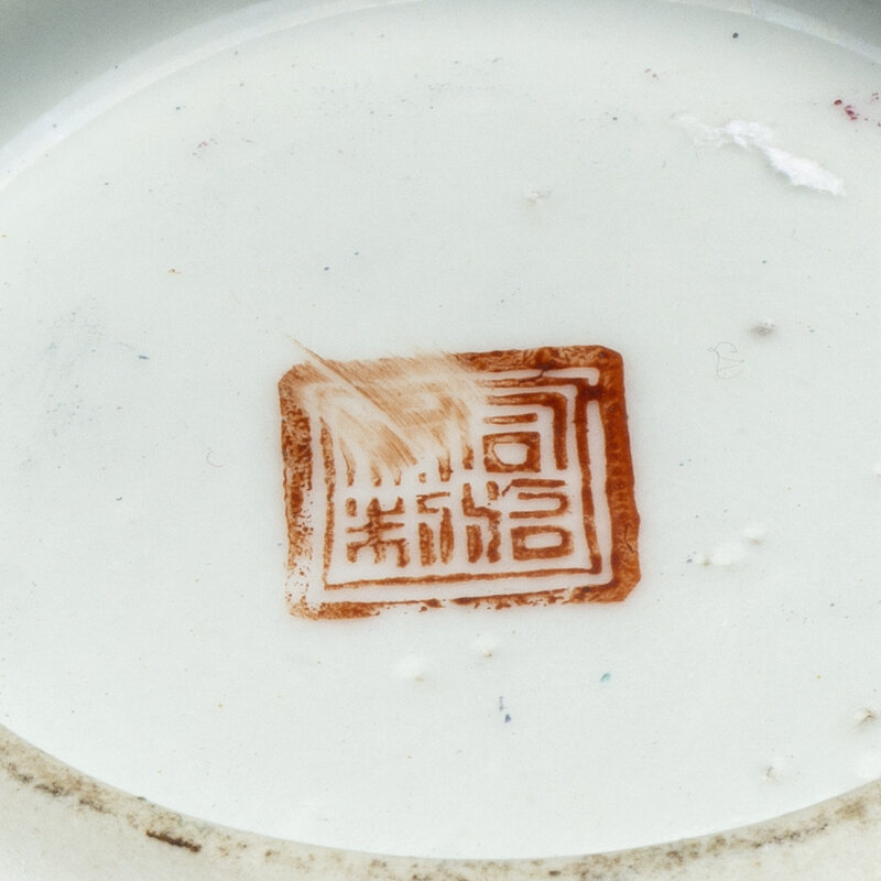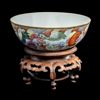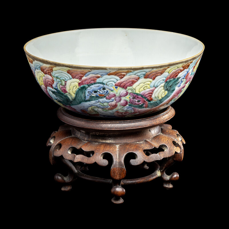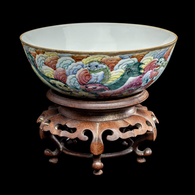 Having sloping walls, painted to the exterior with various fu lions playing with brocade balls amongst clusters of clouds, the concave base bearing a Tongzhi four-character iron red seal mark, together with a hardwood stand.