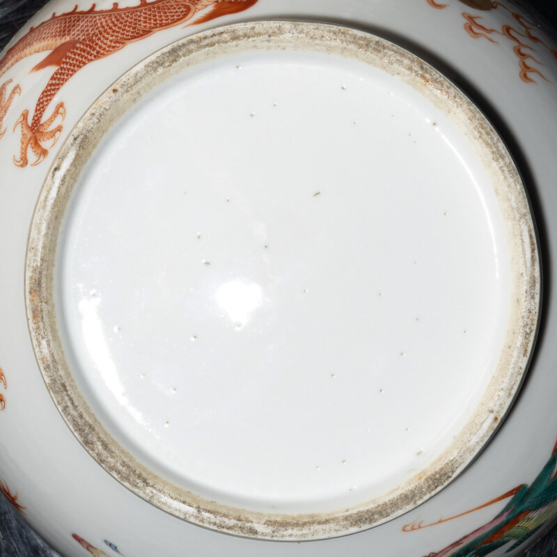 Painted with a ferocious five-clawed dragon in iron-red and a famille-rose phoenix, framed by bands of ruyi-lappets, plantain leaves and keyfret.