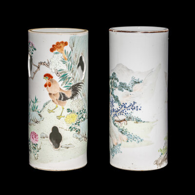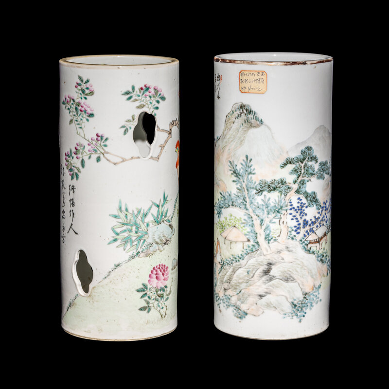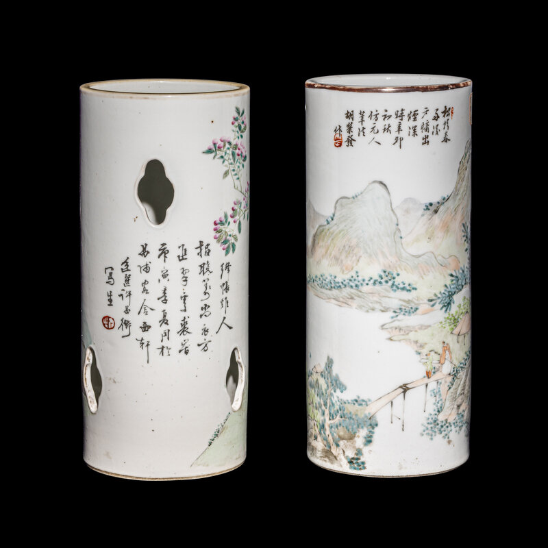 清晚期 淺絳彩花鳥山水詩文帽筒兩件