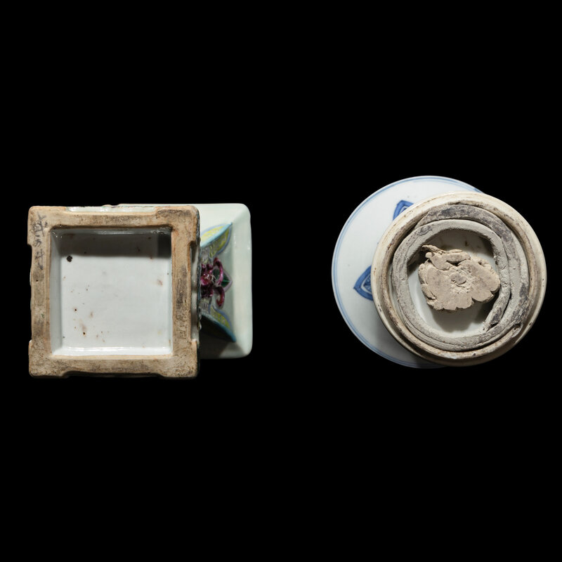 The first is a molded famille rose example, the second a blue and white example.