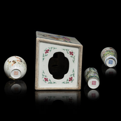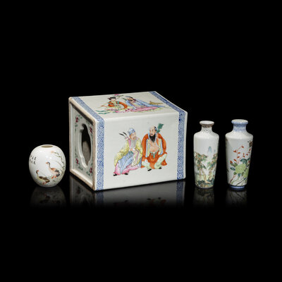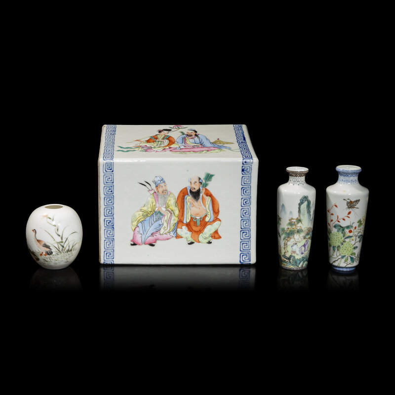 Three Chinese Eggshell Porcelain Vases and a Famille Rose Pillow, 20th Century