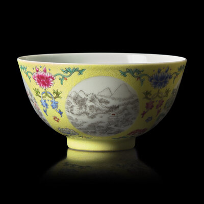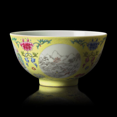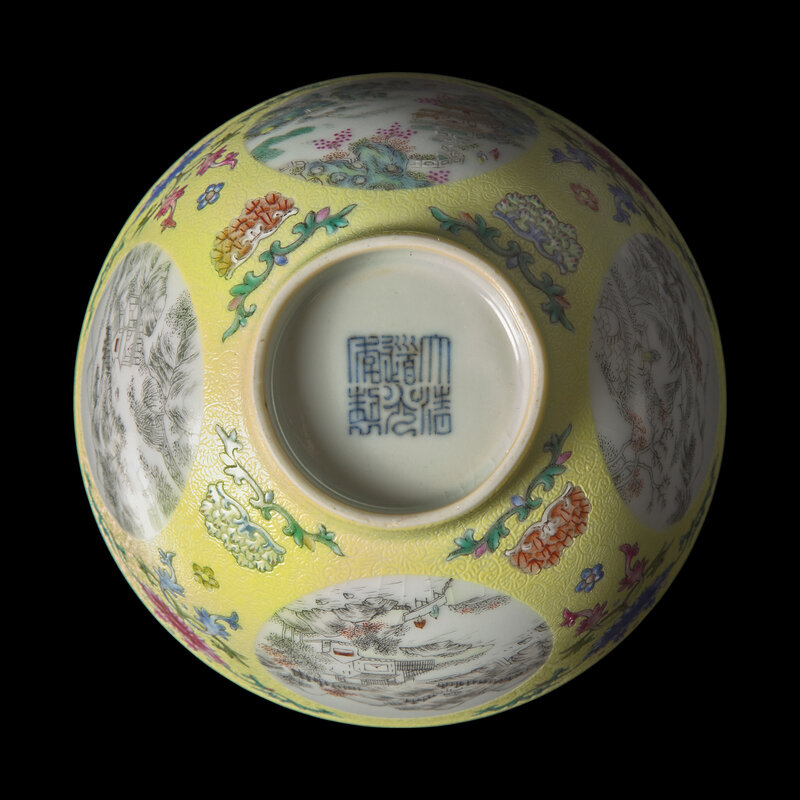 A Chinese Yellow Sgraffito Ground Famille Rose Porcelain 'Medallion' Bowl, Daoguang Mark